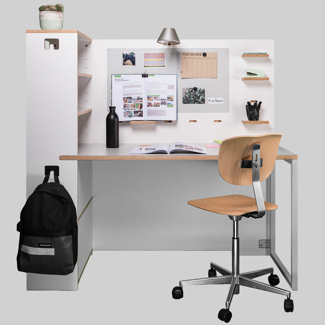 Der Furneem Einzelarbeitsplatz wurde entwickelt, um modernen Lern- und Arbeitsformen gerecht zu werden. Der praktische Sichtschutz ermöglicht ein konzentriertes Lernen und Arbeiten. Kreative Ideen können an der Magnetwand sauber geordnet werden. Ein integriertes Regal und verstellbare Stecktablare ermöglichen, Ordnung am Arbeitsplatz zu schaffen. Um auch das Kabelmanagement aufgeräumt zu halten, gibt es auf der Tischplatte beidseitig Kabeldurchgänge.